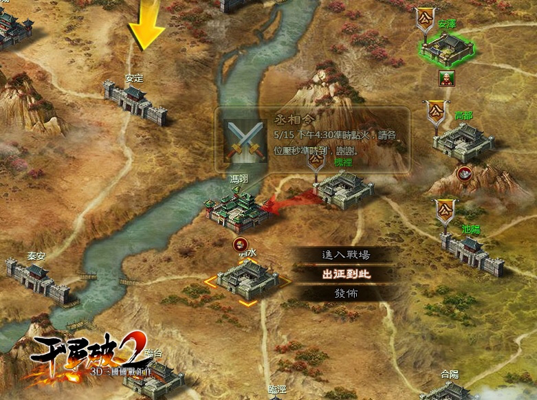 千軍破 2》國戰中,玩家可以點擊城市選擇出征到此,城市爭奪戰的「出征距離」、「出征消耗」、「出征時間」等戰場關鍵因素都需要玩家運用策略頭腦,運籌帷幄採用最少的資源來獲得最大的勝利。