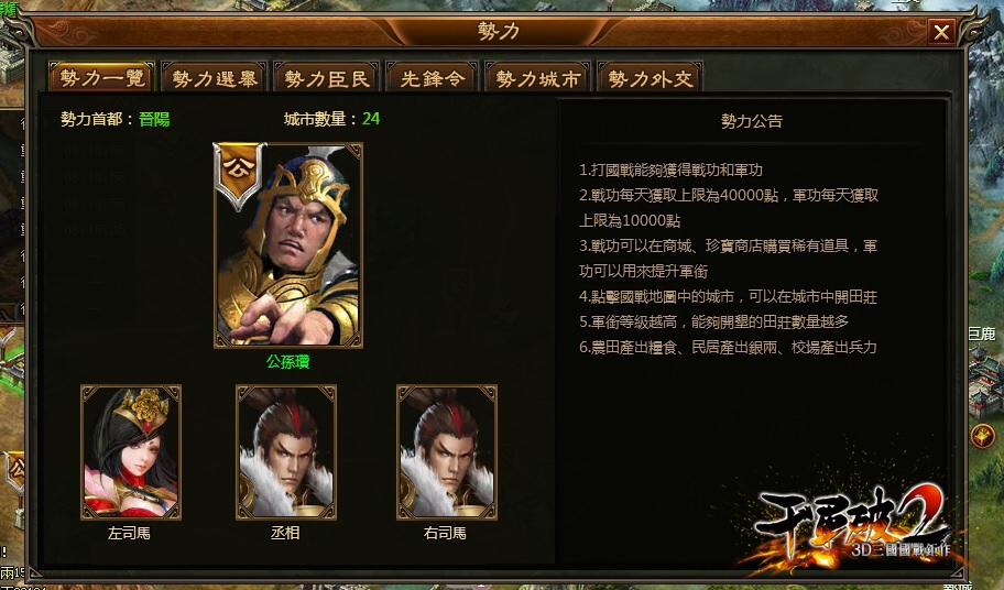 其中「丞相」擔任勢力中重要角色,除了熟知國戰眾多元素:城市、勢力和戰鬥單位,其中城市是提供觸發國戰的戰場所在地,而勢力決定了國戰的對立關係,戰鬥單位則主要是指玩家的武將單位。丞相的選舉和擔任,都直接決定了國戰的勝負。