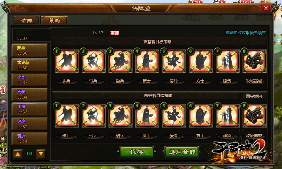 遊戲的佈陣系統增加「策略」功能,能為玩家帶來更加深度的策略體驗。該功能直接影響武將在所有戰鬥中的攻擊優先順序,其中包括攻擊和防守。在這裡,丞相的策略決定了部隊優先攻擊的目標,攻擊目標根據職種分成步兵、騎兵、弓兵、策士、方士、優伶、建築。系統將不同類型的角色分配不同的策略優先值,陣型位置對應的優先值均不一樣。善用此策略將是克敵制勝的重要關鍵。