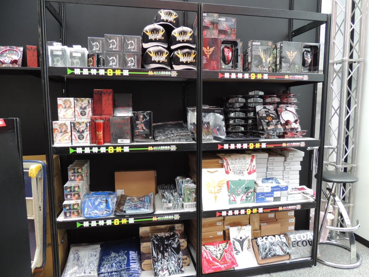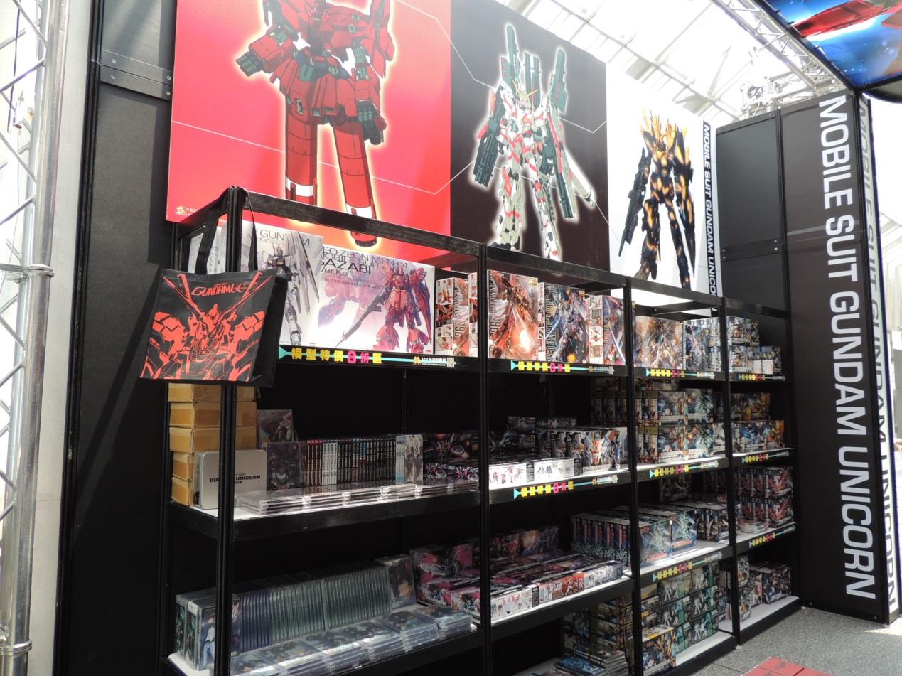 此外,展區首賣全新商品,包括以新吉翁軍徽設計的「鋼彈 UC 軍籍牌項鍊 金色特殊塗裝版」,以及以主角巴納吉和米妮瓦肖像設計的兩款「肖像畫 A4 資料夾」。白色款「鋼彈 UC 耳罩式耳機」附以獨角獸鋼彈頭像、剪影、感應框體設計的四款造型飾片可自行替換。凡是現場消費還可加價129元購買印有獨角獸鋼彈及報喪女妖的黑色不織布「鋼彈 UC 限量提袋」;而現場買任一款模型,即加贈「鋼彈 UC 浮水貼」張(款式隨機贈送)。另外,現場預購《機動戰士鋼彈UC》最終章「episode 7:彩虹的彼端」日本航空版藍光 BD、中文授權版 DVD 還可享優惠。主辦單位表示,為了搶購同步開賣的四款劇場透明限定版模型,一大清早便有超過上百位鋼彈迷在現場排隊守候,創下一小時內銷售一空的紀錄。
