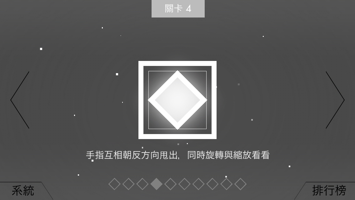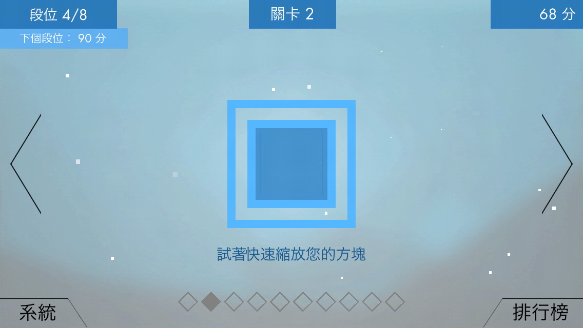 場面上全部方塊消失就算突破現階段關卡,一開始,玩家只能手指拖曳,但隨著不斷的推進遊戲進度,則會有縮放、旋轉等不同的要求,方塊本身也有大小的差異。