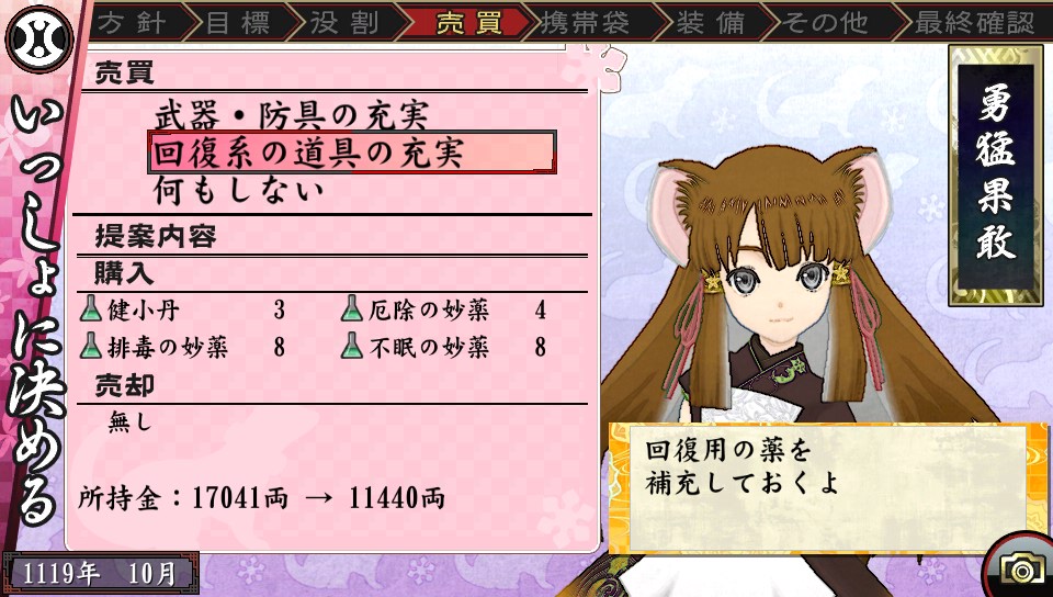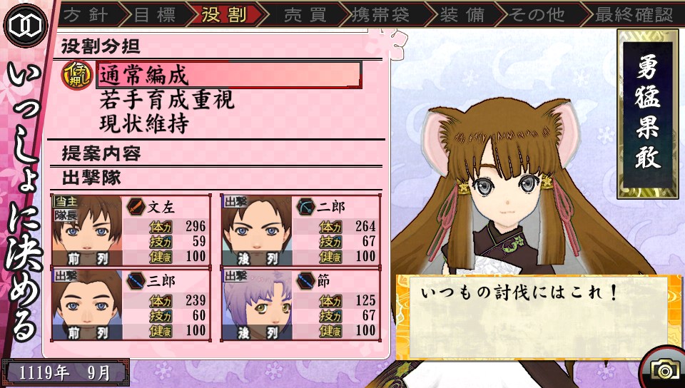 以及該月份的行動方針跟目標,以及裝備品的買賣都由玩家來從蔻琴的提案中做選擇的「一起決定」。