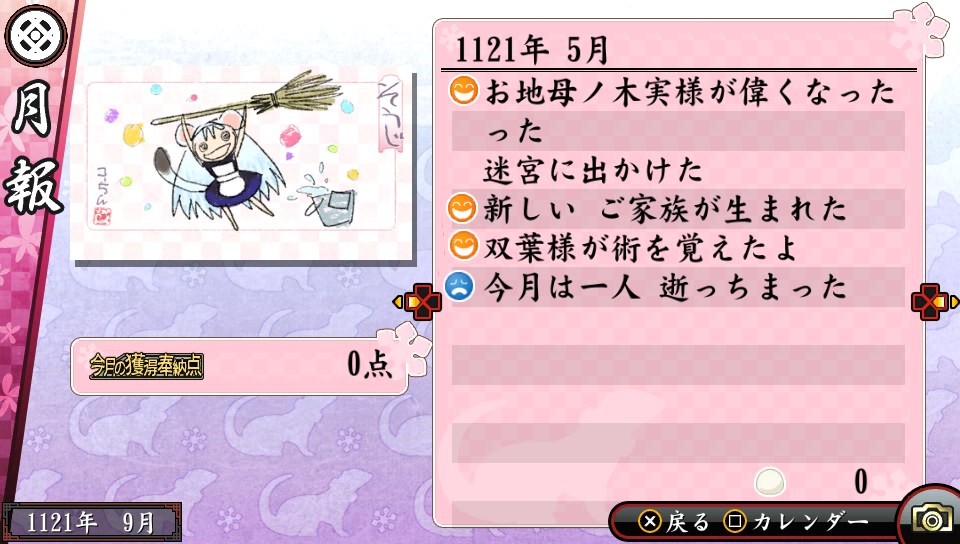 整理出每月所發生的事情,蔻琴的日記。玩家可透過該月份所拍攝的遊戲畫面來回顧一族的軌跡。