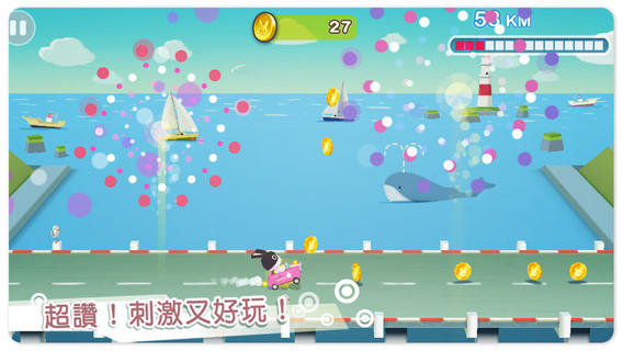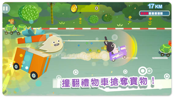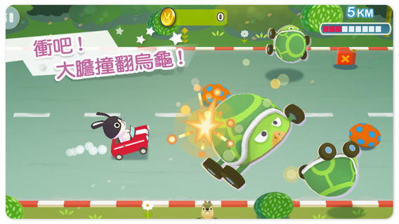 本作的遊戲進行方式相當簡單,只要透過上下滑動手指即可控制車子的方向,持續按住的話則可加速。若是要成功追撞烏龜的話,就必須善用加速並適時躲避眼前的障礙才行。