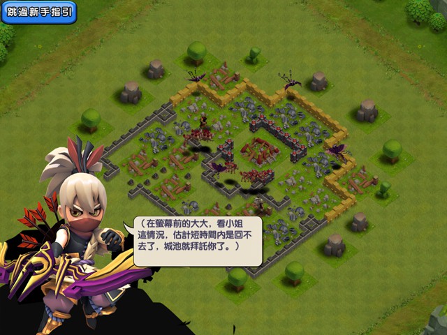 登入遊戲後,眼前出現故事劇情-鷹眼和霸姬帶領一眾士兵攻打敵人的城池。有強大戰鬥力的鷹眼和大小姐霸姬,瞬間就摧毀了敵方所有建築,贏得勝利(這裡的戰鬥過程將會自動進行)。由於鷹眼和霸姬需要遠征短期內無法歸來,所以霸姬的城寨就交給玩家來經營。