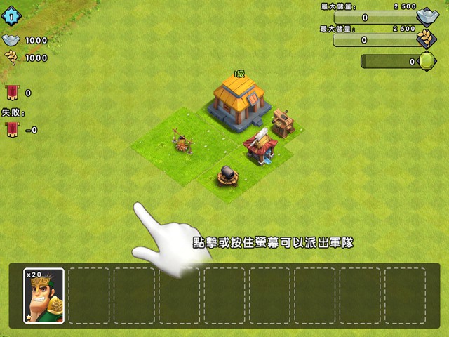 系統將為玩家自動搜尋一座主城,選擇兵種並點擊或按住螢幕就可以派出軍隊。但需要注意的是,軍隊一旦部署完就會自動進行戰鬥,此時將無法控制軍隊。在有多個兵種可以選擇,且不同兵種具有不同優勢的情況下,合理的調整兵力的部署才是大獲全勝的關鍵喔。
