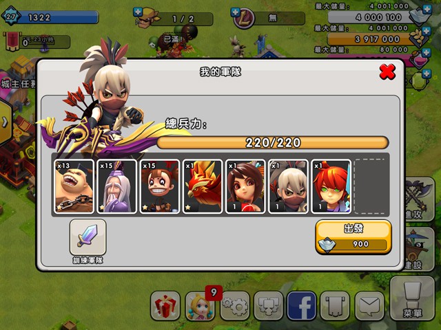 當訓練了足夠的士兵後,就可以進攻其他玩家了。出征界面顯示自己的所帶的軍隊資訊,下方是顯示各種不同士兵數量和等級。各兵種特性均有不同,升級「大本營」、「訓練所」、「營地」可以解鎖高等級兵種,升級強化兵種可以增加兵種的屬性,使之更為強力。