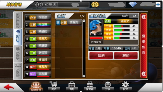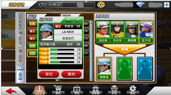 而當玩家有 4 張以上不需要的球員時,可以使用合成功能,換取一張隨機的球員,在遊戲除了透過遊戲幣就可購買的招募券外,合成也是一個獲得高階球員很重要的途徑。