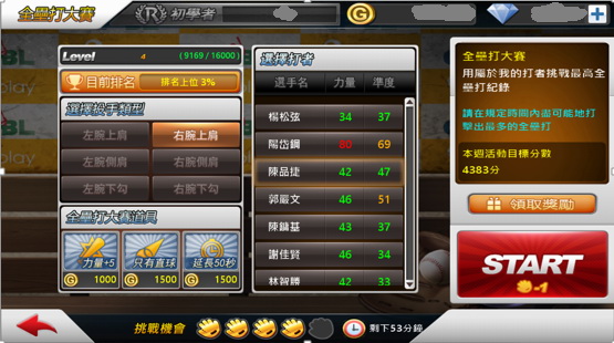 全壘打大賽:在有限時間中能連續擊出最多全壘打的玩家,就能獲得最高的積分,同時還能在全壘打大賽排行榜中與其他玩家一較高下。排名累計截止之後依據排名可以獲得豐厚的報酬及獎勵,對於打擊有自信的玩家,這絕對是你要挑戰的最佳選擇。