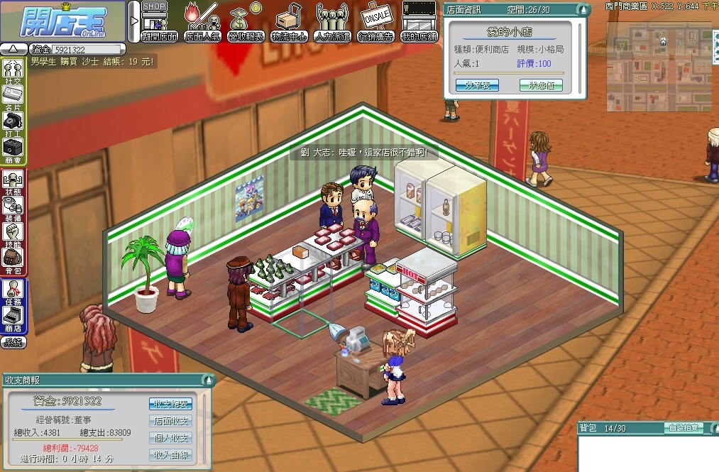 當看著自己的店面從三個貨架增加到三十個貨架,每天的營業額從兩萬變成二十萬時,開店的ㄧ切辛苦都獲得回報。而當賺近千萬資金,擴增店面的那一瞬間,請相信,您將會獲得無與倫比的成就感。下ㄧ步,您將微笑的,盤算著下一個店面要開設在哪裡。而遊戲系統也會隨時公告,目前城市中各玩家店面的經營狀態,並依各類店面人氣排出『開店王』排行榜,讓所有玩家知道您的成就。