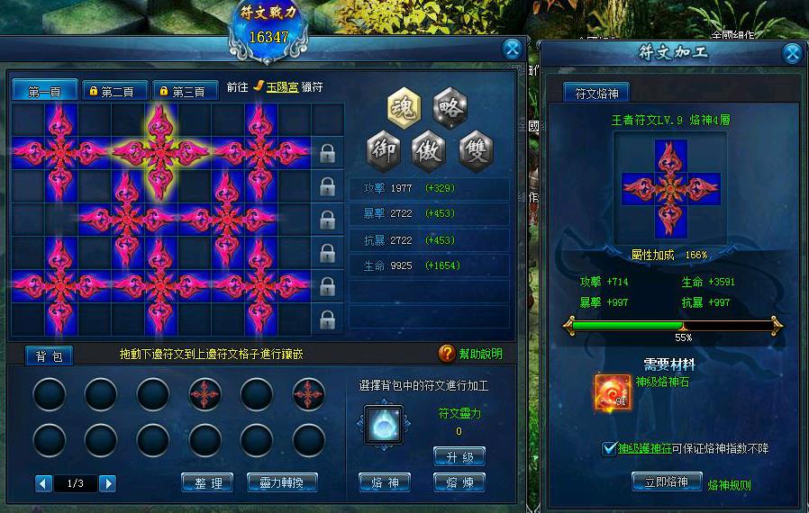 當玩家等級滿50級且符文等級達到4級時可以對符文進行烙神操作,每個符文都有一個烙神值,烙神值數值為0-100,當烙神值滿100後,該符文即可突破升1層,當符文烙神層數的不同,給予該符文魔法屬性加成比不同,加成一次性加成所有符文上的屬性。小編建議使用擁有攻擊、暴擊、抗暴、生命等四種屬性的「王者符文」進行烙神,除了原本王者符文所擁有的戰鬥力外,當提升至5層時,戰力與一般符文比較更高達將近10倍的差異!
