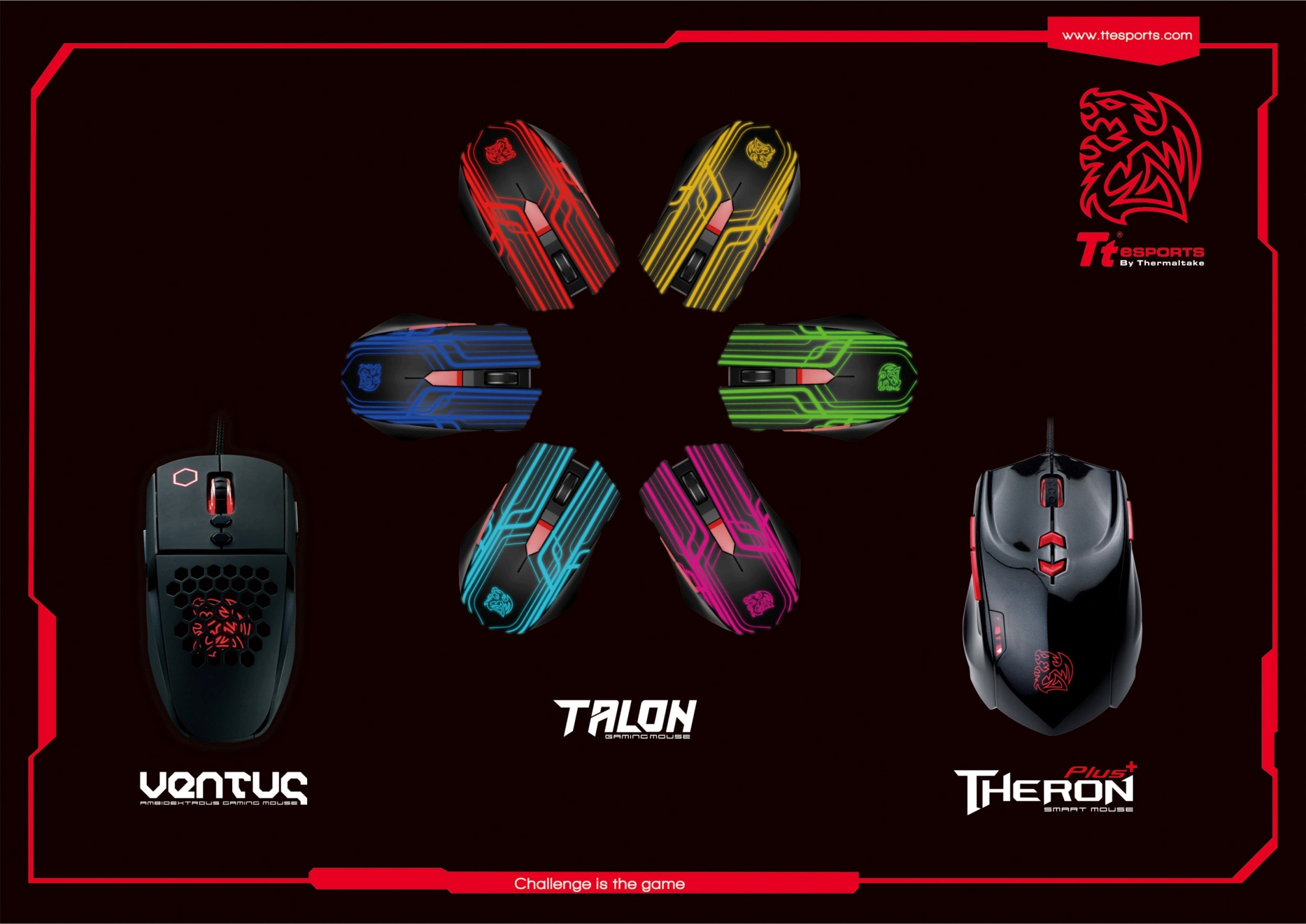 蜂巢式設計與 5,700DIP 感應靈敏度的「夜襲 VENTUS 左 / 右手通用光學引擎電競滑鼠」及「TALON 左 / 右手通用光學引擎滑鼠」、全新進化完成的「閃獵 THERON Plus 智能電競滑鼠」搭配「Tt eSPORTS Plus APP 電競應用程式」及「Tt eSPORTS Plus 線上社群」,獨家呈現創新電競結合量化 (Quantified self) 科技