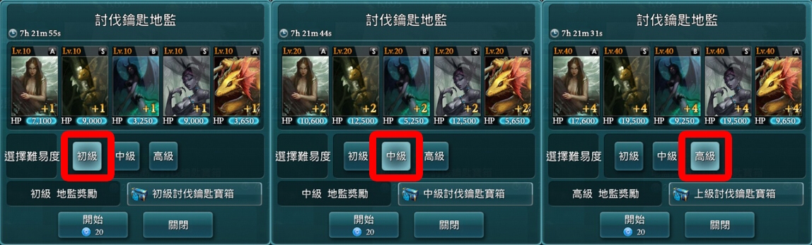 活動地監關卡跟一般不一樣的是可以自己選擇難度,有初級、中級、高級三種,差別在於敵人的等級和技能等級。到了高級,敵人都是等級 40、技能 +4 的程度,我方能出戰的只有 3 張卡,對方則是有 5 張,想挑戰高級之前一定要評估一下自己的戰力,以免被秒殺...