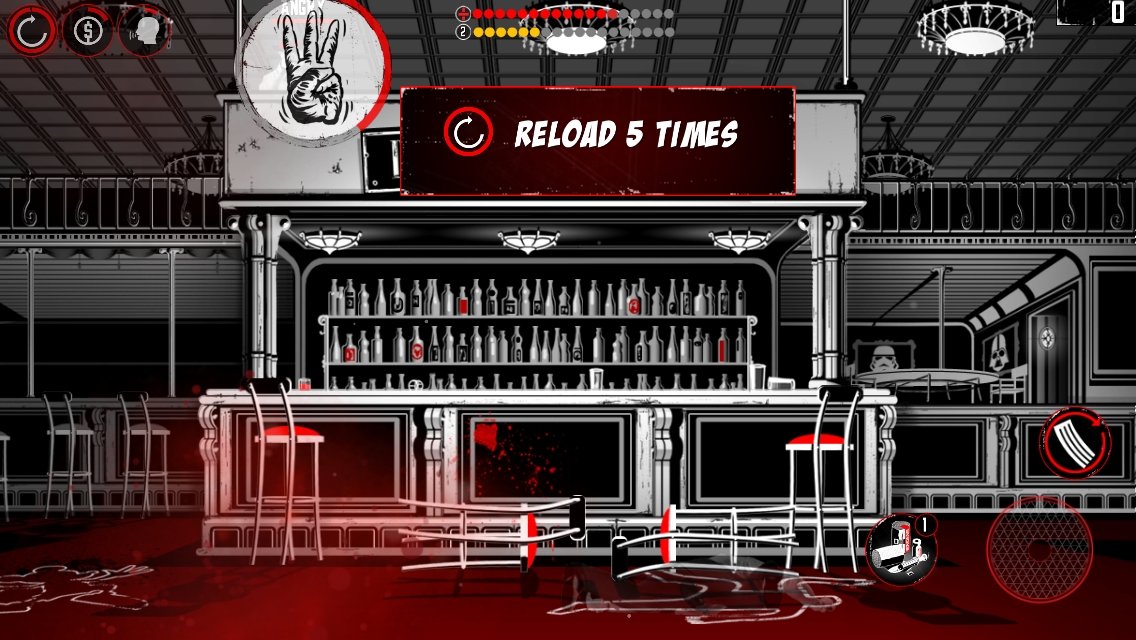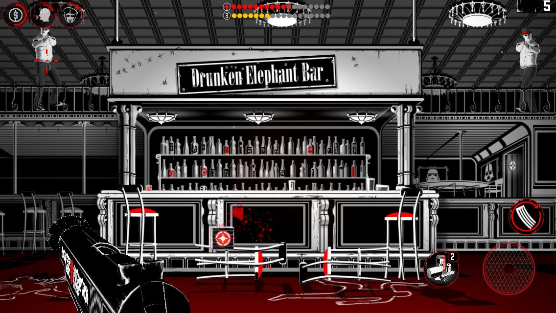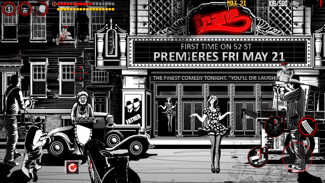 遊戲場景依照關卡的不同而改動,從小酒吧中的室內一直到直接光天化日下街頭駁火,遊戲以純黑白的構圖中參雜一點鮮紅是分外搶眼!場景中人物的造型更讓人想起經典黑幫電影《
