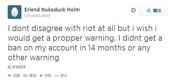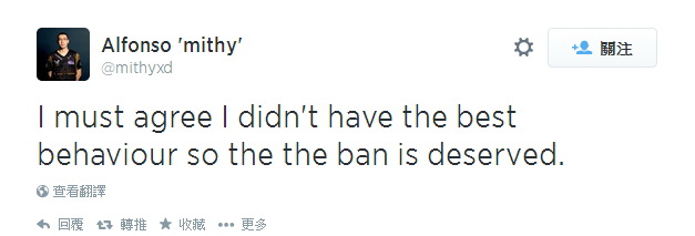 Mithy 也隨即在推特表示:「我承認我沒有做出很好的示範,因此這樣的決定是我應得的」;而 Nukeduck 也表示認同 Riot 的決定,但他希望能先收到一個適當的警告,他指出:「在這 14 個月內,我的帳號沒有被鎖,或是得到其他的警告。」