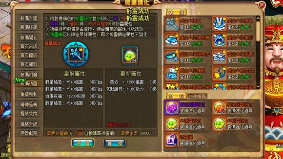 角色技能再躍升,裝備祈靈飆升戰力,PK 各職業戰無不勝!點擊煉器介面“裝備祈靈”選項,40 級以上紫色、橙色裝備、坐騎、翅膀可以進行祈靈。不同顏色的裝備每次祈靈消耗對應的祈靈符文,不同顏色的裝備可獲得祈靈屬性的條數不同;紫色 2 條,橙色 4 條,橙色Ω6 條。祈靈的屬性分為傷害型和減傷閃避型 2 類,分別適合不同部位的裝備。祈靈的獲得屬性從優到劣依次分為 S 級,A 級,B 級,C 級,D 級五檔。每次祈靈會隨機刷出屬性,使用祈靈鎖可以鎖住不想被替換的屬性。唯有刷出適合本職業的祈靈屬性才能發揮作用。
