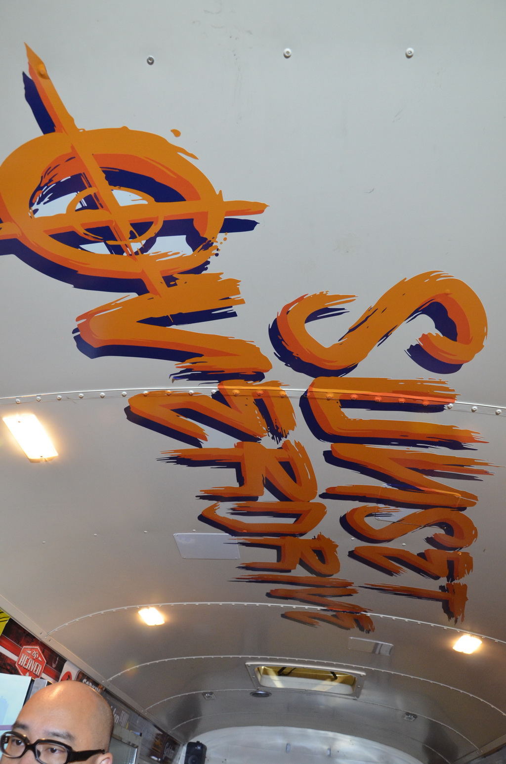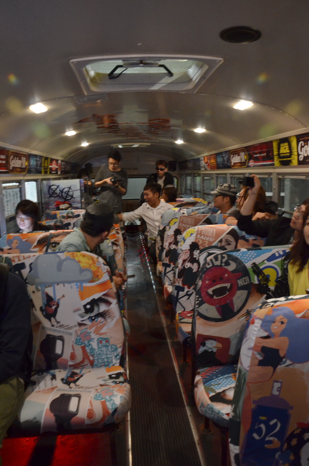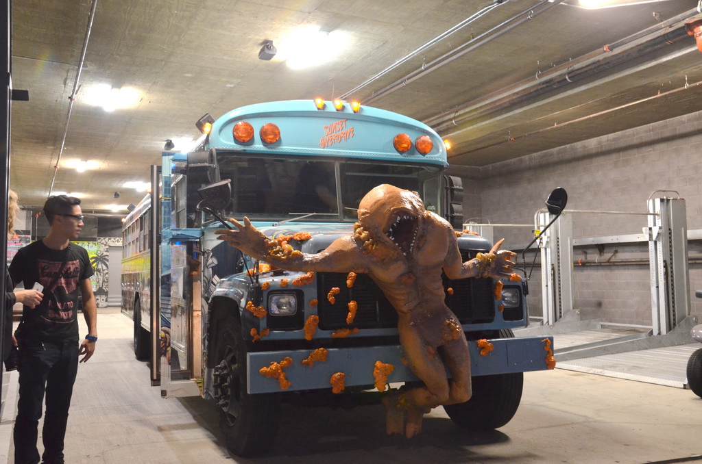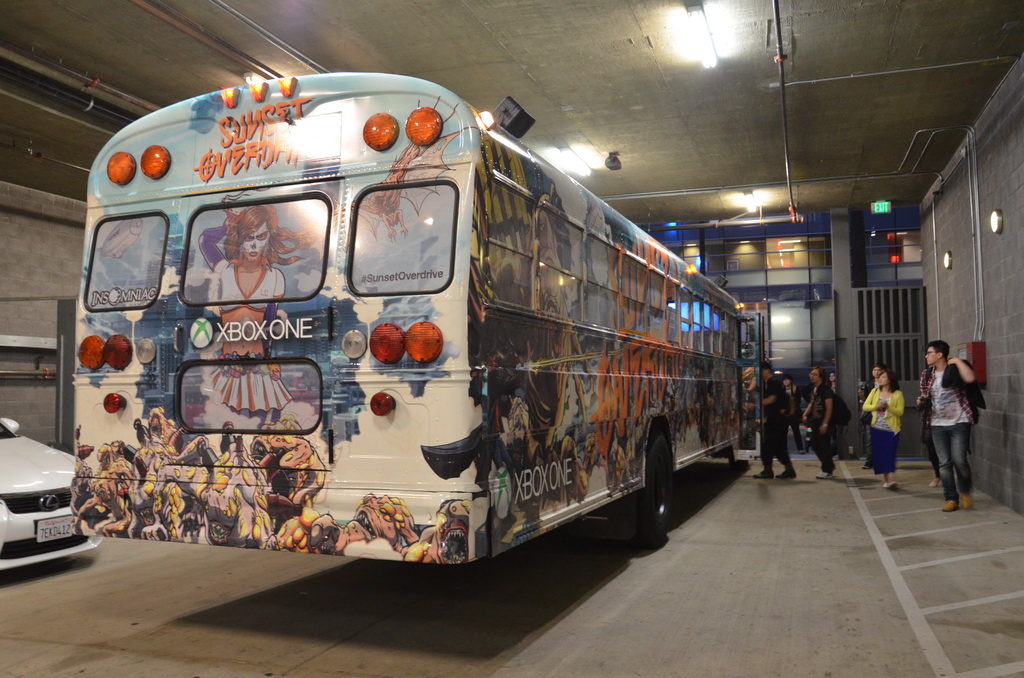 Sunset Overdrive》專屬巴士,從車頭到車尾皆有與遊戲風格相似的設計,車內的椅子也有許多塗鴉,同時車上還有引發