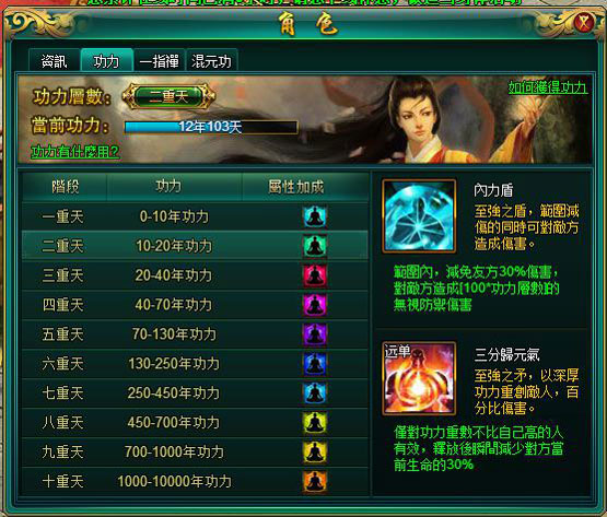 在功力系統中,還有絕對逆天的神功——「三分歸元氣」,大俠在對同一重天或重天低於自身的敵人釋放此技能之後,可直接造成對方損失 30% 的血量,這足以讓對手喪失獲勝的先機。除了三分歸元氣外,「內力盾」也是功力的一大附屬技能,相比於三分歸元氣也毫不遜色!大俠在釋放內力盾後,可以減免友方 30% 的傷害,並且還能對敵方造成無視防禦的固定傷害,功力層數越高,該傷害也越高!高手對決,勝負只在一瞬間,而強大的功力將左右最後的勝局!