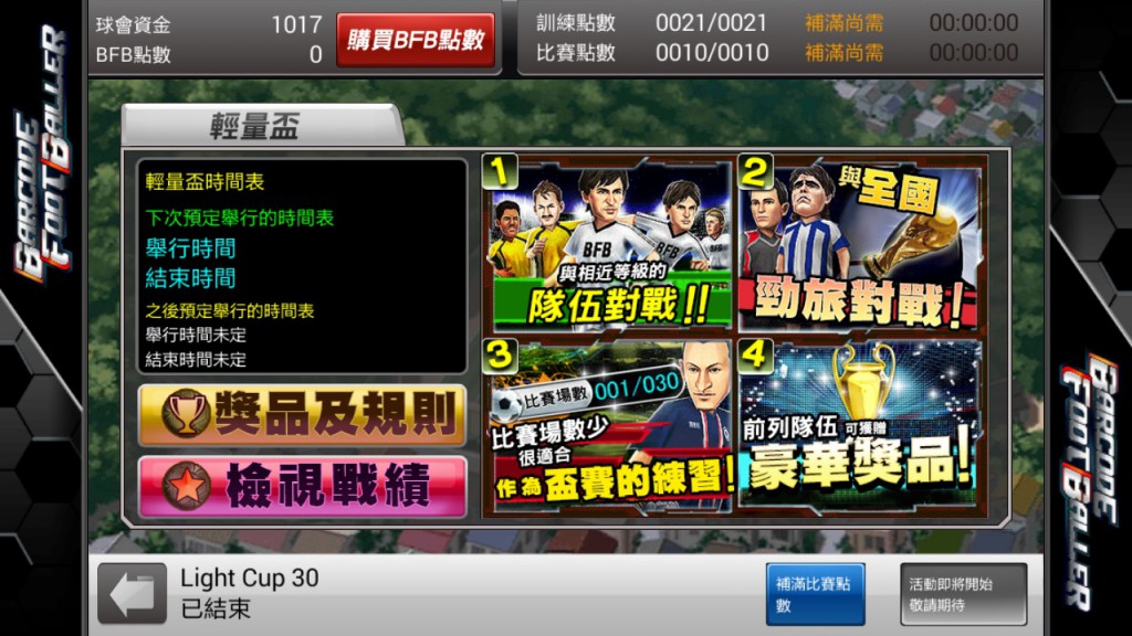 《BFB》本次改版引入全新盃賽「輕量盃」,可在一天內的特定時段裡完成,比賽場次較少,讓玩家選擇參與盃賽時更有彈性,避免因多項比賽重疊造成的壓力,競爭性也不會像大型盃賽那麼激烈,讓玩家能夠悠閒地享受比賽,感受另一種遊戲樂趣。