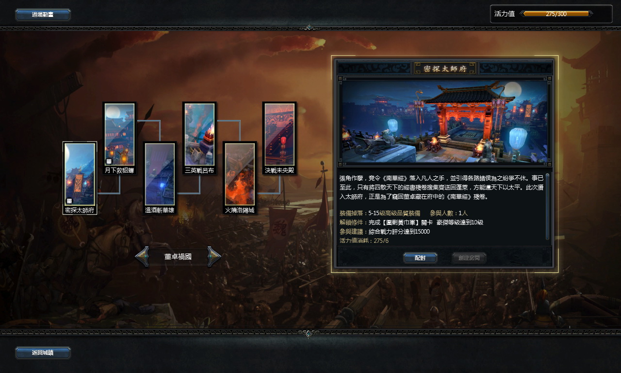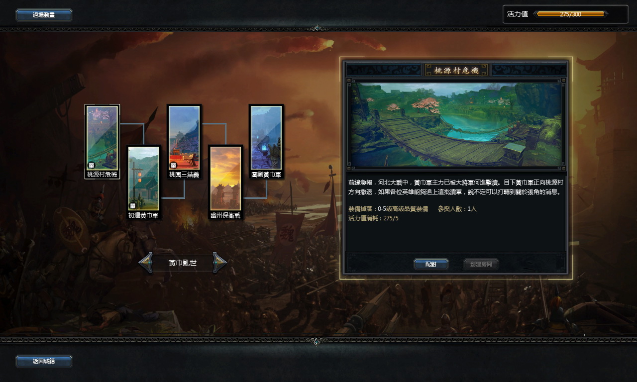 遊戲在封測期間 PVE 劇情副本全關卡開放玩家挑戰,玩家可以一起來通過「黃巾亂世」的試煉,或是解救蒼生的「董卓禍國」。遊戲橘子表示,6 月 14 日至 22 日玩家首次登入遊戲即可獲得一組「首登禮」,讓祥雲坐騎與雙倍經驗卡一同拼生死。