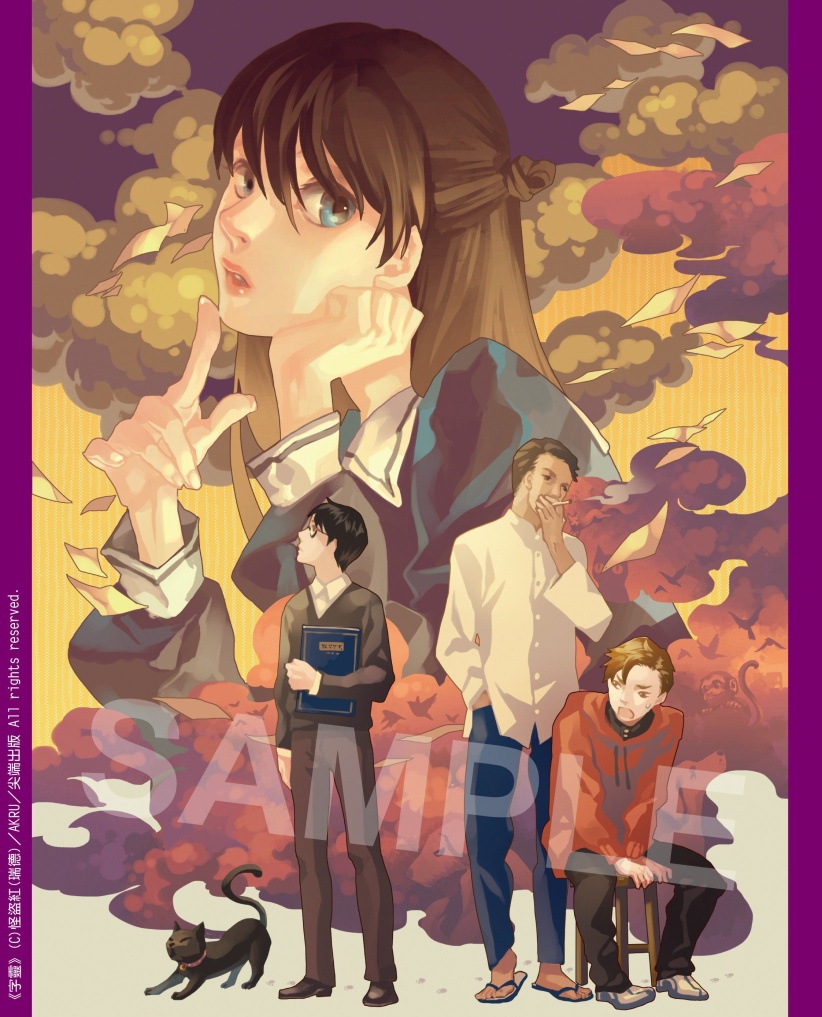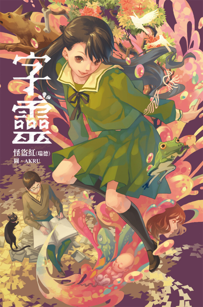 字靈》中是個關鍵人物(?),所以編輯部要求 AKRU 務必畫上小黑貓,而老師也完全回應了我們的期待,不只小黑貓,許多故事中的配角,例如學姊、小黃狗,都鮮活的呈現在封面上。而我本人最喜歡的就是右方的青蛙,如此跟老師說明時,老師竟回答:「P.S. 我最想畫的就是青蛙XD」嗯嗯,這個巧合完全跟《