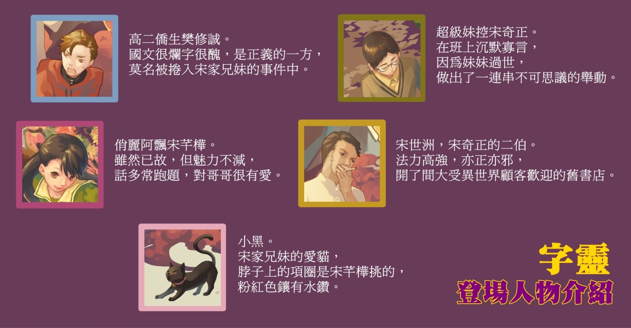 《字靈》是本次尖端浮文字新人獎推出的金獎作品,描述擁有將靈魂封印在自己畫裡能力的哥哥,與陰陽眼妹妹,再加上有靈異體質的主角樊修誠,三人一起解決各式各樣,或歡樂或感人的不可思議事件。