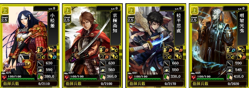 松平忠直(德川家康之孫):是四個武將中,攻擊力最高的一位,擅長統御足輕及騎兵。