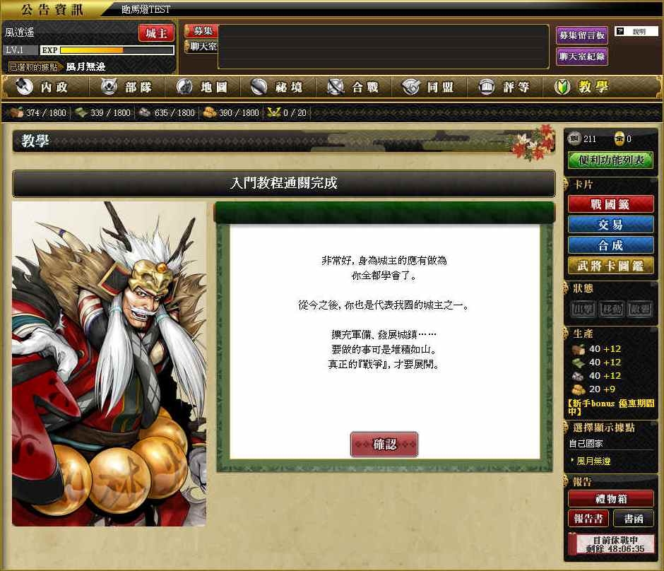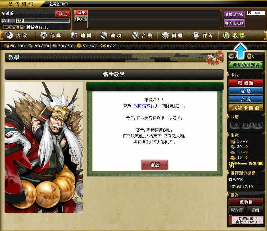 戰國 IXA》對於第一次接觸遊戲的玩家設計了新手教學模式,玩家除了可以藉此了解到整個遊戲目標外,同時還將可以熟悉各個系統、指令的整體操作等。這部份對於我們能不能比別人更有效率的發展國家,是有很大的幫助喔,因此玩家在進行新手教學時,一定要確實的了解。