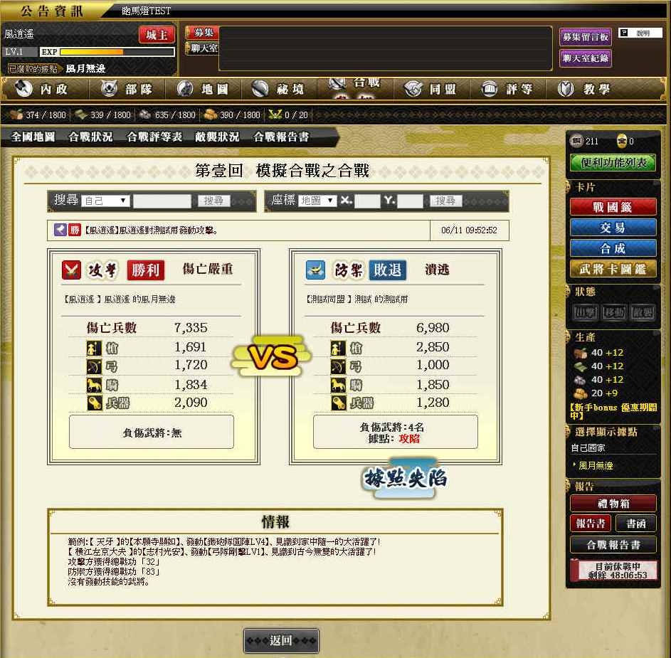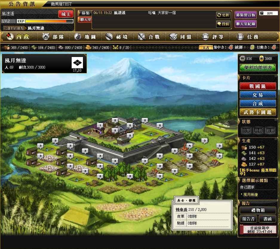 在合戰開打之前,會有個投票過程,票選結果將決定此次合戰要跟哪一國開火,所以合戰對象是靠投票來產生,並不是我們想打哪一國就打哪一國喔。關於合戰,很可惜的是在測試的期間並非合戰日,因此沒辦法跟玩家分享更多的心得,這部份就留待之後再來做更深入的介紹吧。