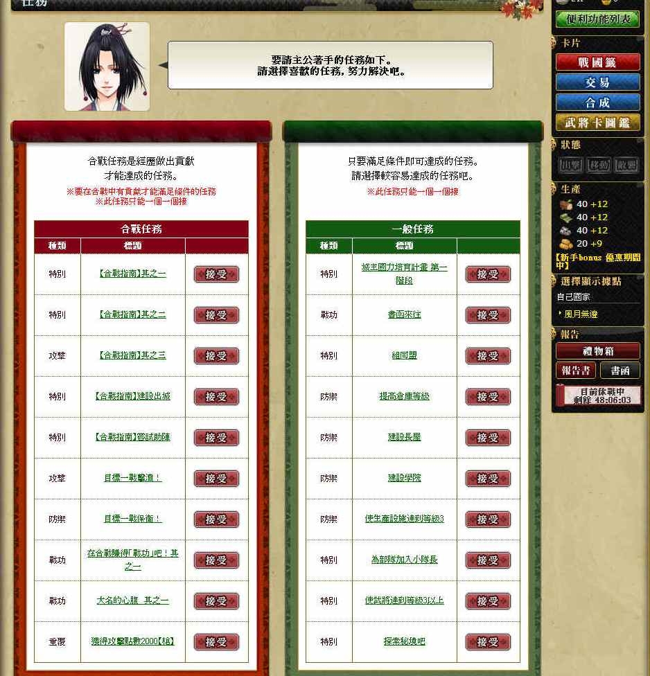 一般任務大部份就是要我們蓋建築物或是提高資源產量,還有部隊編組,而獎勵多半也都是資源;而合戰任務就是一定要進行合戰,才有可能達成的,獎勵則是兵力較為常見。