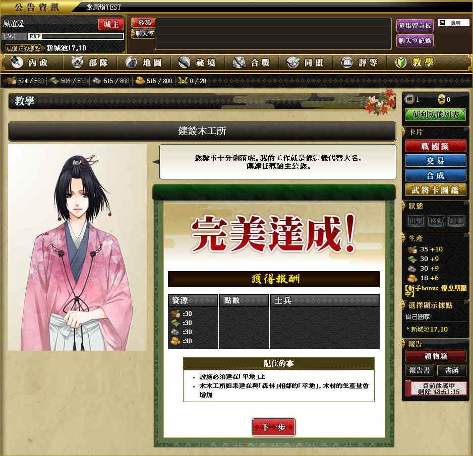 一開始,玩家要先從內政做起,內政就是發展資源、提升建築物等級,基本上四種資源都不可或缺,所以請平均發展,然後建築物的部份,也請優先蓋倉庫,提升資源的儲存量。初期發展的時候,玩家一定會覺得資源好少、累積速度好慢,但只要我們搭配適當的任務來進行,就可以有效累積資源。