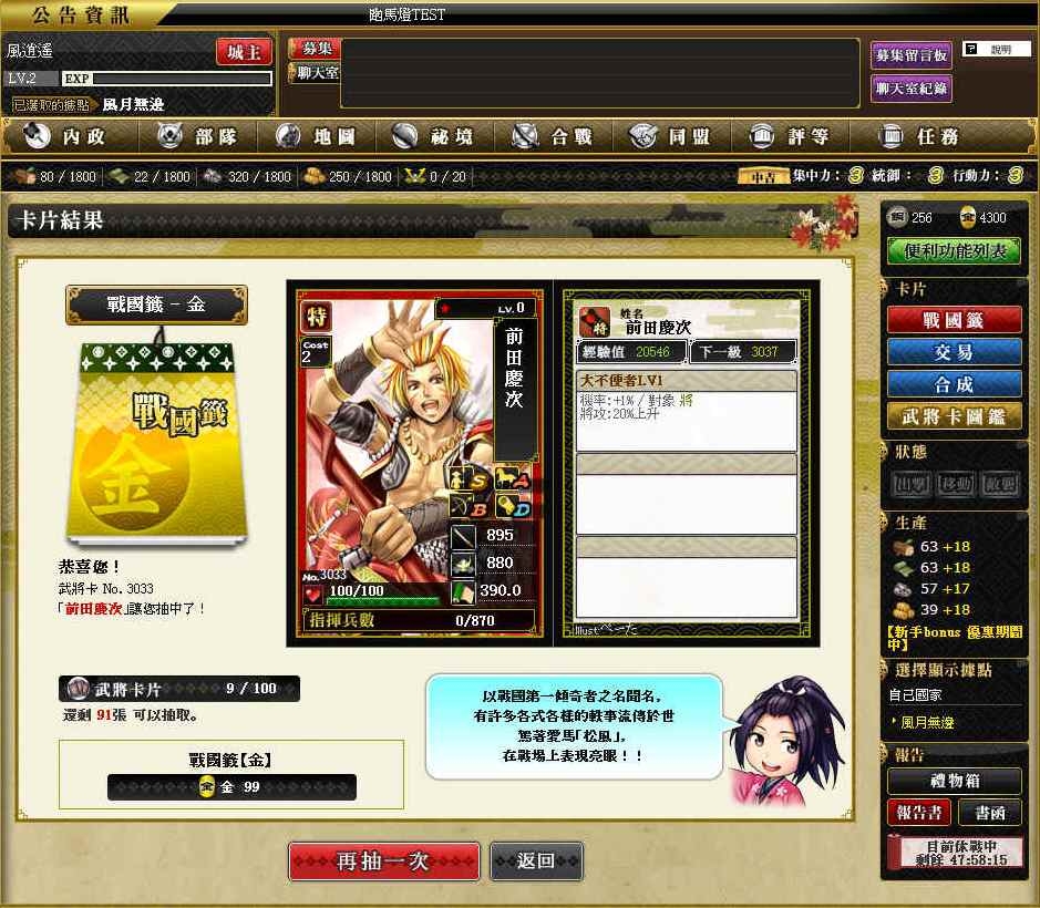 哇~太開心了,抽到前田慶次這名猛將了!