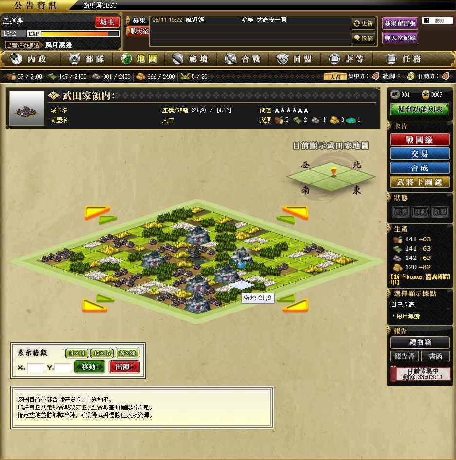 而要讓武將升級,也很簡單,當有了兵力之後,就可以把他們分配給武將,有帶兵的武將才能組成部隊。部隊形成後,就可以讓武將去征討野地,除了可以賺經驗值外,還有機會帶回一些資源,但是征討野地之前,請記得要先查看那塊土地的等級,等級越高的駐兵就越多越強,一開始請先從一星、二星的土地開始吧。