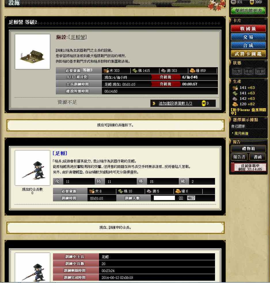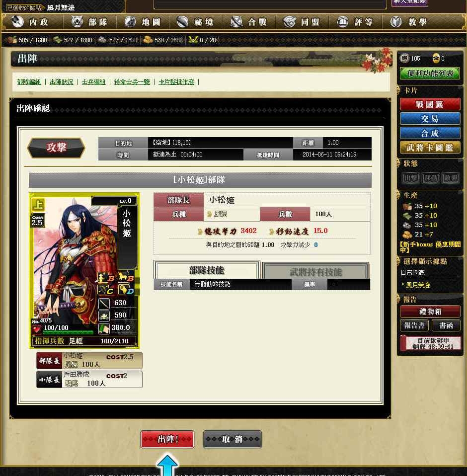 當累積了部份資源時,玩家就可以開始為合戰準備了,首先最需要的就是兵力,以及提升武將的等級。在生產兵力之前,玩家要先確認目前手上的武將,適合帶哪一種兵,千萬不要明明就沒有騎兵適性的武將,卻生了一大堆騎兵喔。
