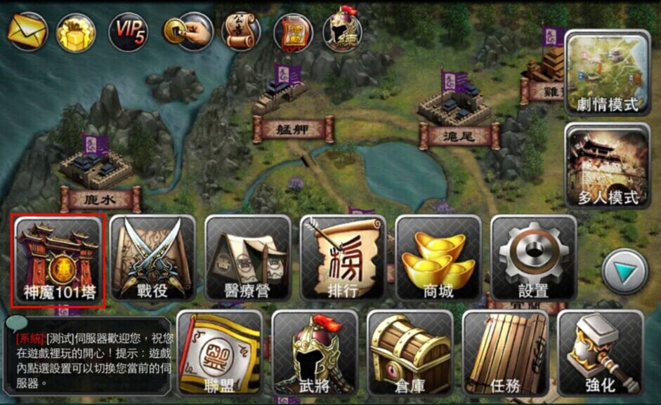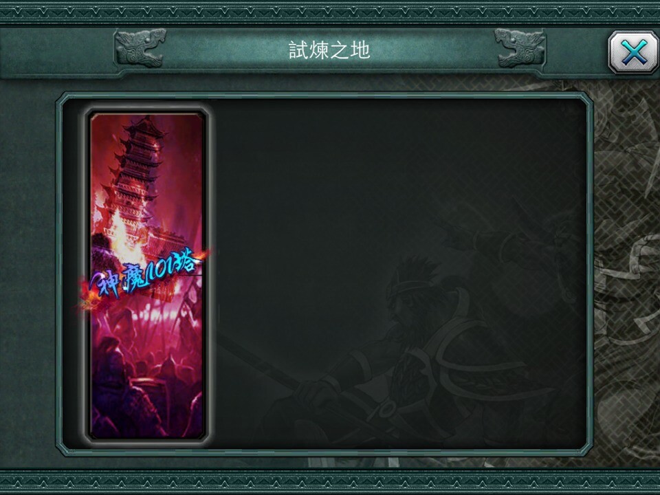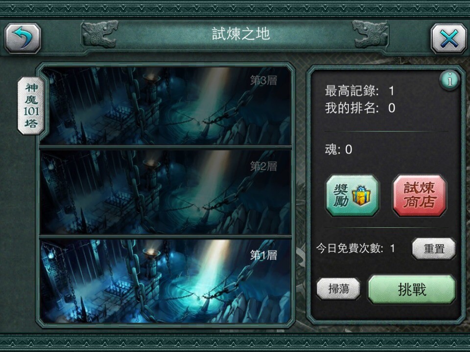 神魔 101 塔共有 101 層;玩家們 101 塔透過主介面戰役左側的「試煉」按鈕,進入神魔之塔,進入之後每層都有神魔武將駐守,打敗每層的守衛都會獲得相應的獎勵,另外,VIP 還會有額外的獎勵喔!層數越高,獎勵越豐厚,傳說到 101 層必得武將化神材料 - 高階武魂,擁有高階武魂的玩家可透過神將台進行化神。