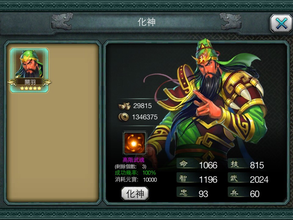 多人模式中透過神將台,可有機率獲得武將化神材料 - 高階武魂,擁有高階武魂的玩家可透過神將台進行化神,武將化神後會獲得三圍屬性加成和神武將技等,改版開通五虎將化神。
