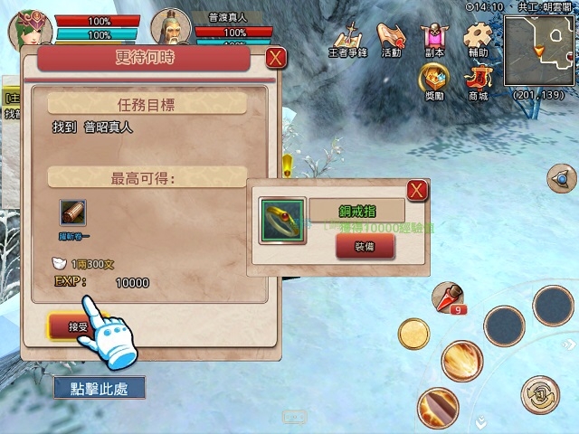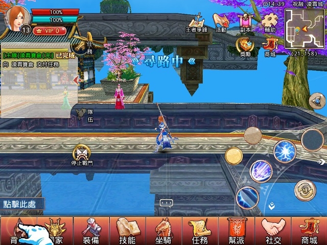 在凌霄城學習了多種技能,很快就要派上用場了。根據任務的指引將會來到王城之外,完成一系列難度升等的打怪任務。
