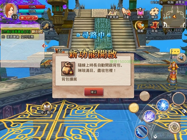 恢弘的凌霄城總是一副平和安寧的樣子。這時根據上線時間長度自動開啟的背包就會隨之開啟,除第一格擴展需要點擊開啟之外,其餘背包格會隨著在線時間的累積而自動開啟,倉庫亦是如此。