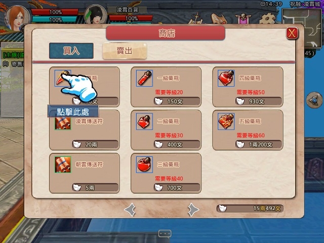 系統功能欄通過點擊角色頭像開啟與關閉,點擊任意藥品,會在藥品詳細介紹的右下方有一個設定快捷,這樣就能快捷使用藥品了。技能欄上方有兩個藥品快捷鍵,一個是瞬回藥品太極丹用,另一個則是普通藥品快捷鍵。普通藥品可在淩霄百貨處購買。
