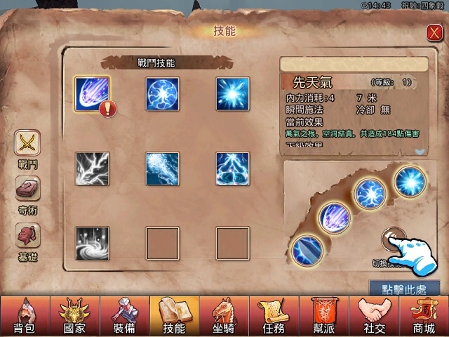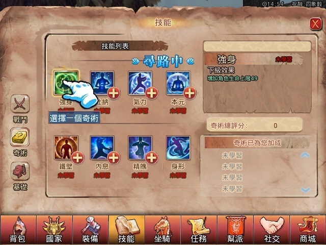 擁有了精良的裝備,怎能不提升一下戰鬥技能?進入技能界面,點選【奇術】就可以選擇想要學習的新技能。隨著玩家的等級不斷升高,學習的新技能將得到不斷強化。