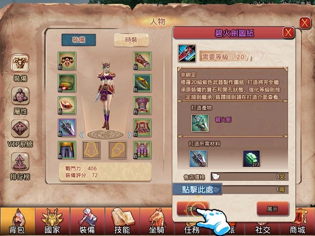 遊戲後期,玩家也需要更加強大的裝備來武裝自己。在隨後完成任務而獲得的獎勵中會出現裝備圖紙。進入背包界面,點選裝備圖紙再選擇【使用】,就可以進入打造頁面,蒐集完素材就能得到更強大的新裝備。