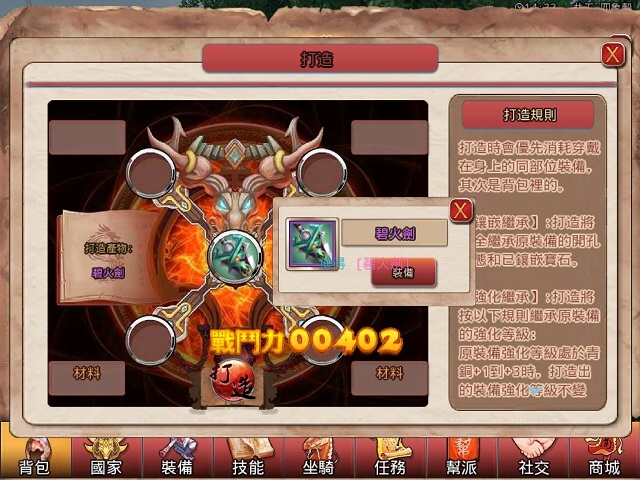 升級裝備在戰鬥中是非常重要的!在背包中找到需要升級的裝備,進入裝備界面點擊【強化】即可。更為高級的強化就需要求助於遊戲的寶石系統了。在獲得打孔鑽之後,進入裝備界面點擊【開孔】,為鑲嵌寶石進行準備。需要注意的是,一件裝備只可以鑲嵌四顆寶石。