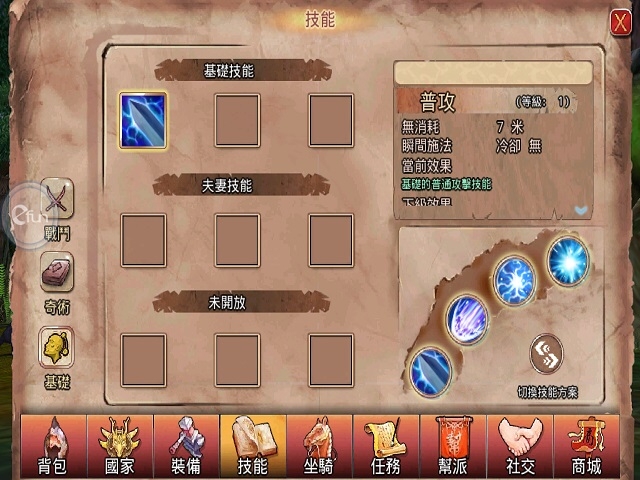 仙國志》的技能系統是遊戲的一大特色。技能系統除了戰鬥技能外,還有奇術和基礎。奇術內包含了八大奇術,每種奇術都代表著一種屬性,可根據自身職業的特點來進行學習,從根本上增加角色的能力。戰鬥技能就是職業技能,技能會隨著主線任務的完成而解鎖。在基礎內,除了基礎技能,還有夫妻技能。夫妻技能究竟是什麼技能,就待玩家自行去探索了。