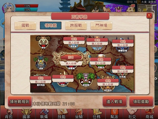 領地是幫派實力的象徵,也是壯大氏族必要的條件。一幫之主可在固定時間進行領地戰申請,透過幫派資金競價進行篩選,是否具有充裕幫派資金也是對幫主號召力的考驗。如佔領“淩霄城”的幫主將直接成為本國國王。值得注意的是,“淩霄城”每小時產出的幫派資金和幫派聲望是所有領地裏面最高的,所以王城可說是各大幫派的必爭之地。