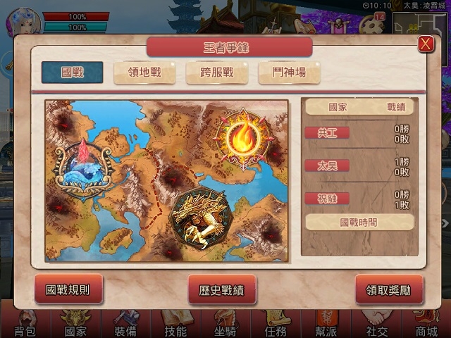 在國戰的部份,攻方勝利後將可使用許多額外獎勵系統,例如消耗國庫資源可開啟打怪雙倍,掠奪守城方國庫資金充實本國勢力等。防守方透過擊殺攻方人數也可獲得額外獎勵。