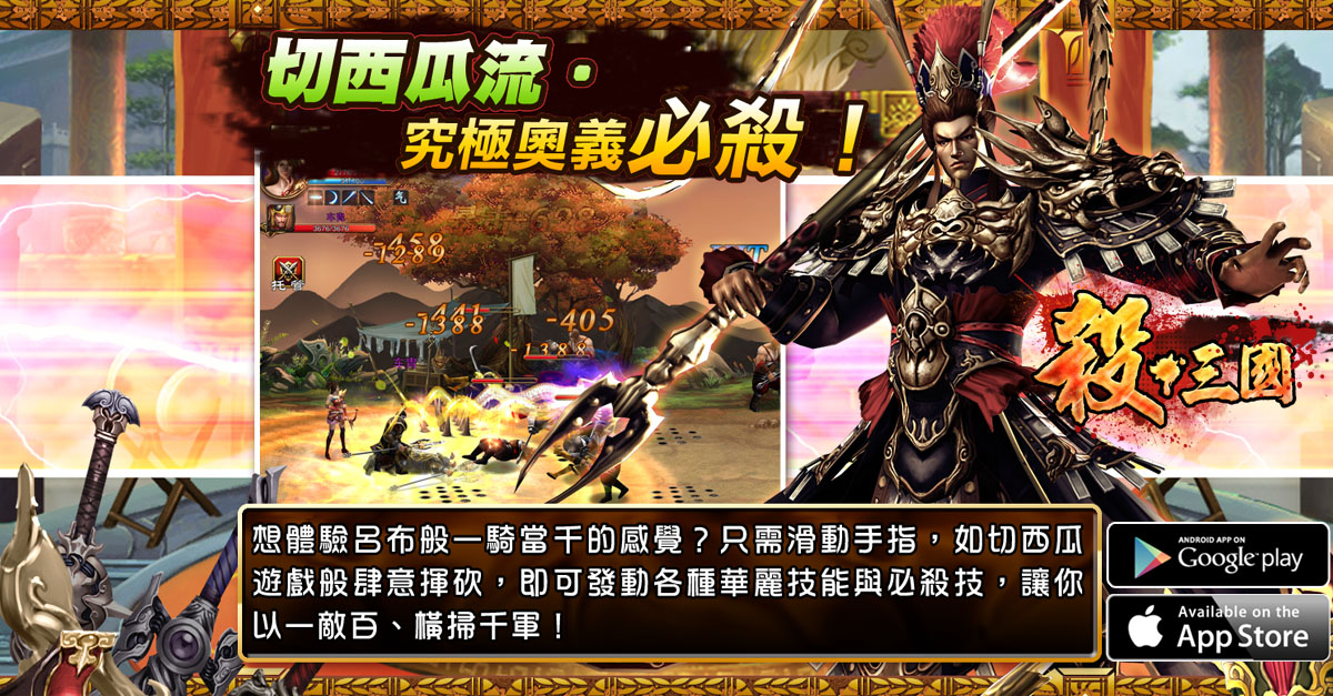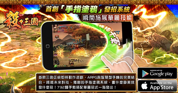 殺三國》遊戲架構是沿用正統橫向捲軸的 ARPG 玩法,玩家將在壯闊的三國背景下,進行格鬥闖關。本作強調簡單易上手的遊戲設計,獨創『手指塗鴉』發招系統,畫什麼圖案就發什麼招!732 種手勢搭配華麗招式一指發出,輕鬆體驗爽快的戰鬥!
