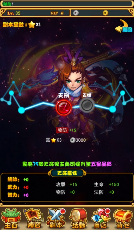 天命系統可讓玩家透過消耗副本過關後的星星數量來強化自己屬性,最後還能進階五星武將