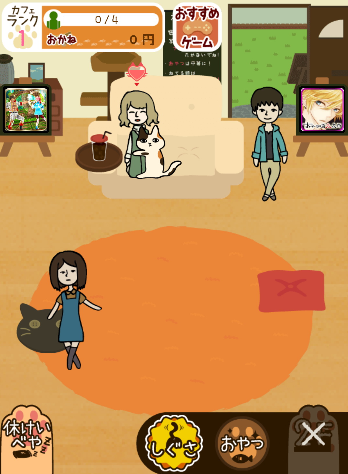 遊戲的進行方式很簡單,客人會陸續的進入店內坐下,此時玩家只要觸碰客人貓咪就會過去緊貼著客人,這時客人頭上的愛心計量表就會陸續上升,全滿後客人就會非常愉悅的付下餐點費離開。