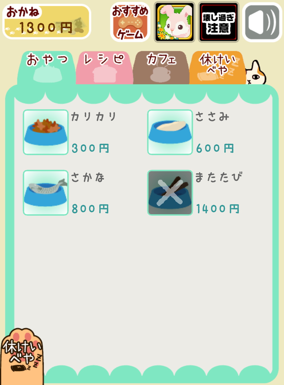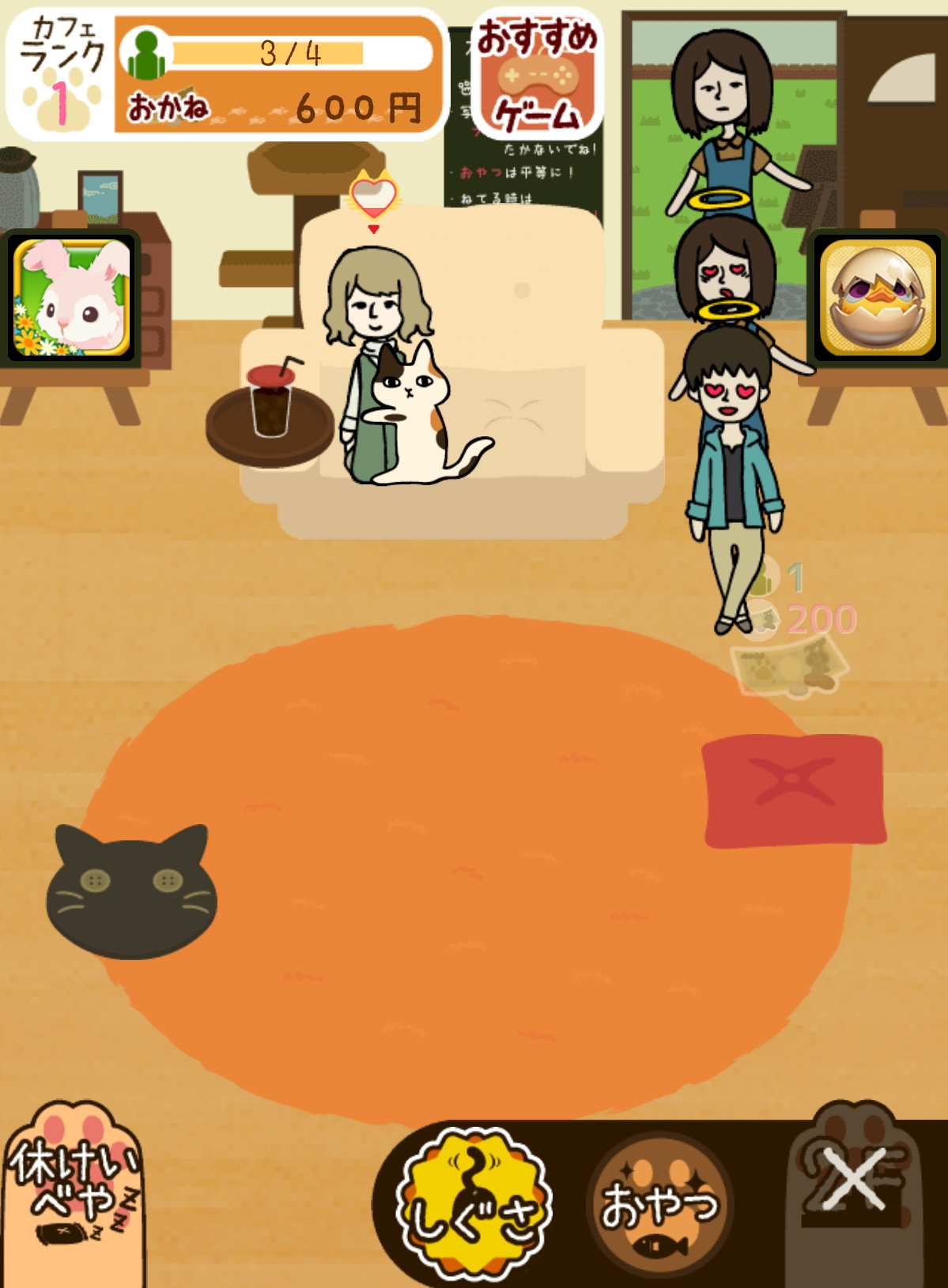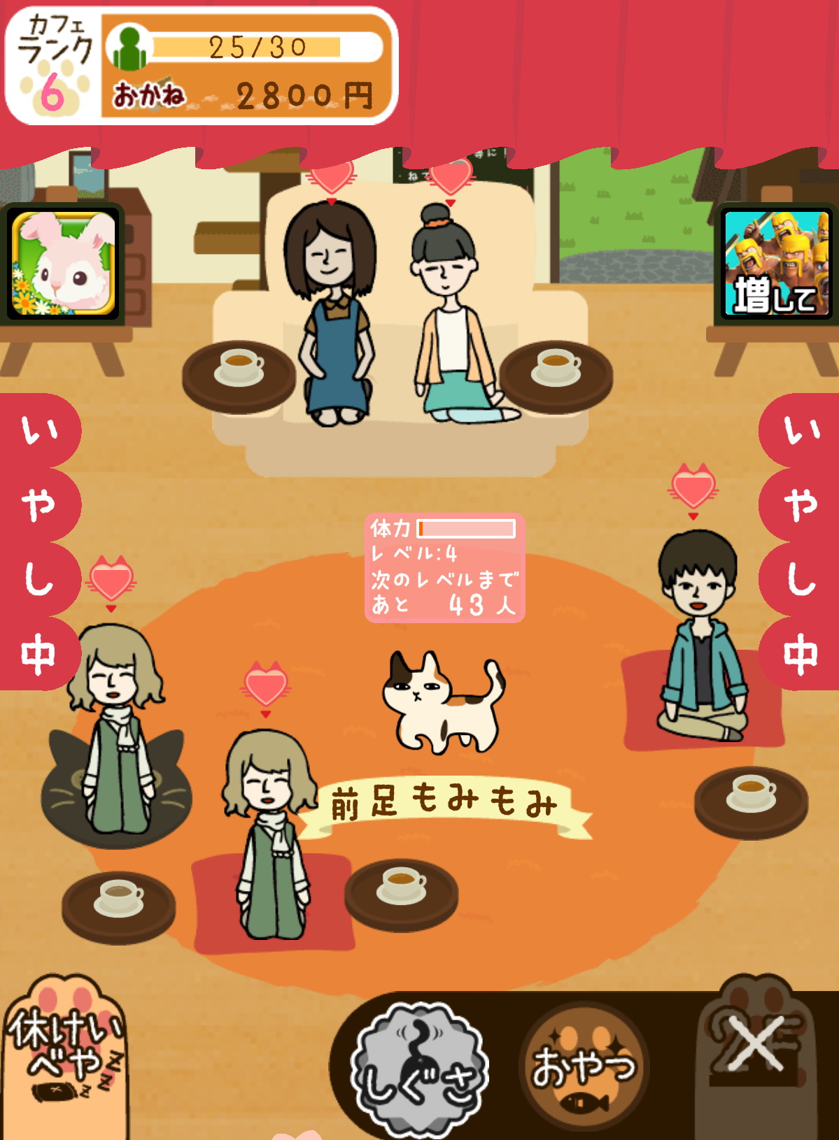 不過因為貓咪們每治癒 4 位客人就會消耗一些體力的關係,所以當沒體力時就必須按下畫面左下的休息室(休けいべや)讓貓咪休息恢復體力。