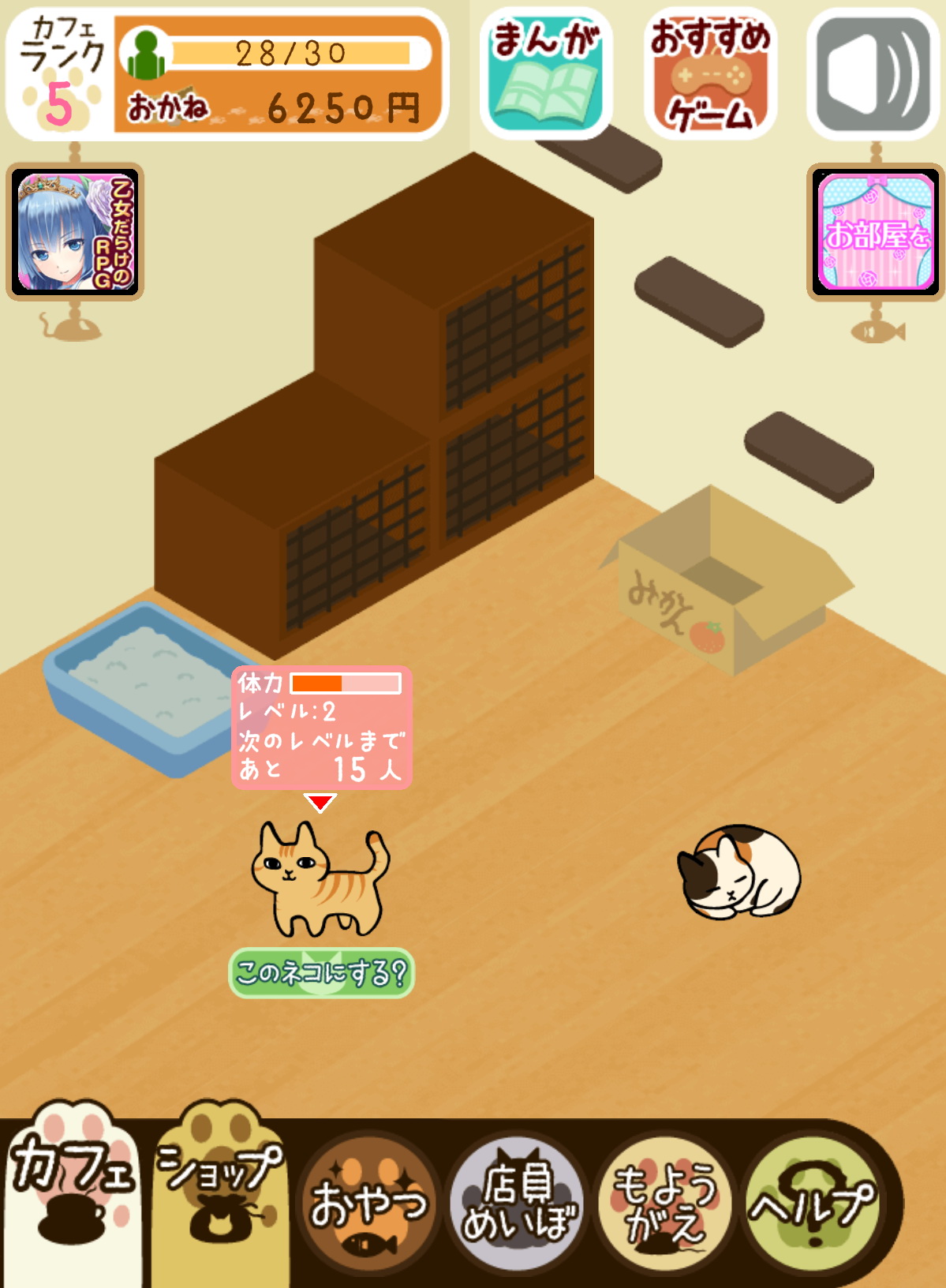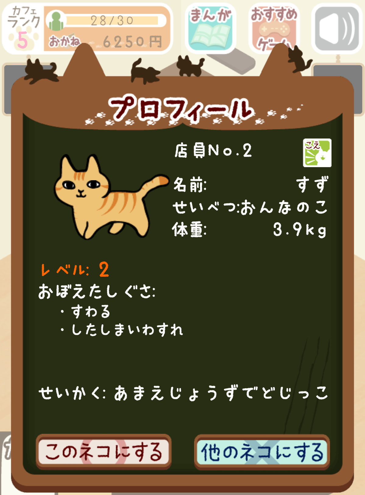 而當客人數累積到一定程度時,咖啡店等級也會提升。咖啡店等級提升除了會增加在休息室可以欣賞的貓咪漫畫之外,在一定等級時還會增加貓咪店員。